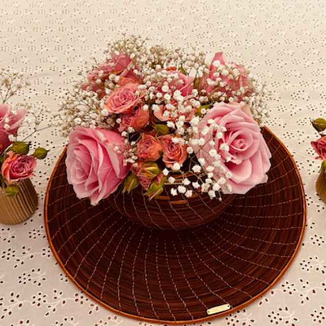 Cada pieza está meticulosamente elaborada a mano con fibras naturales de esparto y cosida con cobre por hábiles artesanos colombianos de Boyacá, lo que demuestra su dedicación y cuidado.